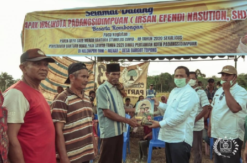 Pemerintah Kota Padangsidimpuan panen Raya Cabai Merah yang dipusatkan di Kelompok Tani (Koptan) Mekar, Desa Bargot Topong, Kecamatan Padangsidimpuan Batunadua, Rabu (21/4/2021). Ketua Kelompok Tani Mekar Arifin Siregar pada kesempatan tersebut mengucapkan terimakasih karena telah mendapat bantuan bibit cabai merah yang hari ini akan di panen. Arifin juga mengucapkan terimakasih kepada Bapak Walikota yang telah menyempatkan hadir pada kegiatan penen tersebut. Walikota Padangsidimpuan Irsan Efendi Nasution SH ,pada sambutannya mengungkapkan rasa bangga dan terimakasih kepada Koptan Mekar atas panen raya yang baru saja dilaksanakan, “Apalagi panen yang di lakukan sebanyak 5 kali ini sudah mencapai 4 ton, mudah-mudah panen kedepan yang di perkirakan 4 atau 3 kali lagi dapat memenuhi target kita yang sudah kita targetkan di waktu kemaren sebanyak 7 ton,” ucapnya. Pada kesempatan yang sama Camat Kecamatan Padangsidimpuan Batunadua, Robiul Harahap mengucapkan terimakasih kepada pemerintah yang sudah memberikan bantuan stimulas covid-19 berupa bibit cabai merah diwilayahnya. Robiul juga bangga kepada Kelompok Tani Mekar yang dinilai berhasil, “Ini sangat membantu masyarakat kelompok tani, khususnya kelompok tani mekar di desa bargot topong dalam masa pandemi covid-19 saat ini,” ucapnya. Acara panen raya tersebut juga dirangkai dengan pemberian bantuan berupa bibit benih sawah dari Dinas Pertanian Padangsidimpuan kepada Koptan Mekar. @Sumber : humaskotapadangsidimpuan