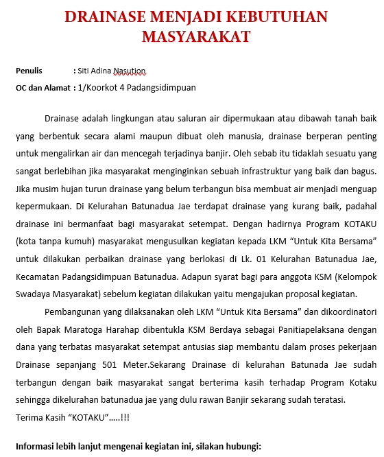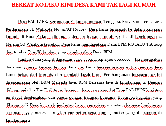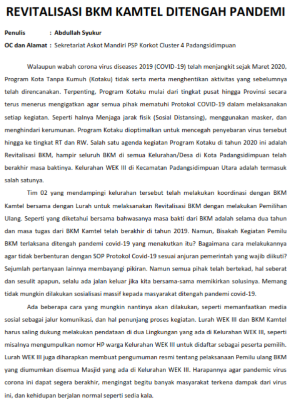 Tahun 2020 merupakan tahun ke-4 Program Kota Tanpa Kumuh (KOTAKU) berjalan di kota Padangsidimpuan. Dan untuk kesekian kalinya kota Padangsidimpuan tidak pernah absen mendapatkan alokasi dana Bantuan Dana Investasi (BDI) ataupun sekarang disebut dengan Bantuan Pemerintah Untuk Masyarakat (BPM). Untuk tahun 2020, sesuai dengan Keputusan Menteri Pekerjaan Umum dan Perumahan Rakyat (PUPR) No. 167/KPTS/M/2020 tentang Penetapan Lokasi dan Besaran Bantuan Kegiatan Infrastruktur Berbasis Masyarakat Tahun Anggaran 2020, kota Padangsidimpuan masuk pada kategori Penerima BPM KOTAKU Peningkatan Penghidupan Berkelanjutan (Livelihood) untuk 2 (dua) kelurahan yaitu Kelurahan Lubuk Raya dan Kelurahan Timbangan dengan masing-masing besaran Rp. 1.000.000.000 (satu milyar rupiah). Keaktifan Pemerintah Kota Padangsidimpuan ditunjukkan setelah Tim KOTAKU Padangsidimpuan melakukan Audensi ke Kantor Walikota Padangsidimpuan pada tanggal 19 Februari 2020, dimana Walikota Padangsidimpuan Bapak Irsan Efendi Nasution, SH sangat antusias dan mendukung penuh kegiatan program KOTAKU khususnya di tahun 2020 melalui kegiatan Infrastruktur Livelihood. Komitmen itupun didukung dengan Surat Komitmen Pemerintah Daerah kota Padangsidimpuan yang ditandatangani oleh Walikota Padangsidimpuan. Tidak berhenti sampai disitu saja, koordinasi internal dilakukan ke Dinas terkait yang tergabung dalam Pokja PKP Padangsidimpuan, misalnya Dinas Perdagangan, Dinas Lingkungan Hidup, Dinas Perizinan, Dinas PUPR, Dinas Perumahan dan Kawasan Permukiman. Koordinasi ini bertujuan untuk menguatkan OPD untuk turut mendukung kegiatan Program KOTAKU sesuai arahan Walikota Padangsidimpuan. Pada tanggal 15 Juni 2020, PPK Wilayah 1 Provinsi Sumatera Utara Bapak Akhiatul Akbar menyambangi kantor Baplitbangda Kota Padangsidimpuan dalam rangka menguatkan kembali komitmen Pemda untuk mendukung Program KOTAKU di tahun 2020 khususnya. Bertemu dengan Kepala Baplitbangda kota Padangsidimpuan Bapak M. Jusar Nasution, menjelaskan bahwasanya kegiatan Program KOTAKU tidak akan maksimal tanpa dukungan dan kolaborasi Pemda, baik dari segi pendanaan maupun kegiatan. Menyahuti kedatangan Pak Akbar selaku PPK Wilayah 1 Provinsi Sumatera Utara, Baplitbangda selaku Badan Koordinasi menginisiasi Rapat Koordinasi dan Kolaborasi bersama seluruh OPD yang terkait untuk bersama-sama memahami dan mendukung kegiatan Program KOTAKU melalui kegiatan-kegiatan yang ada di masing-masing OPD tersebut. Kegiatan Rapat Koordinasi dan Kolaborasi yang dilaksanakan pada tanggal 18 Juni 2020 tersebut sangat membanggakan, karena seluruh OPD yang hadir turut memberikan suara dan dukungannya. Dan dari pertemuan itu juga lahir komitmen kolaborasi yaitu : Pengadaan Peralatan Produksi dan Pelatihan akan didukung oleh Dinas Perdagangan di tahun 2021. Pengurusan IMB akan disupport oleh Dinas Perizinan, Dinas PUPR tanpa dipungut biaya seperpun. Pengurusan Dokumen SPPL akan sangat dimudahkan oleh Dinas Lingkungan Hidup. Pembangunan Jalan akses menuju Rumah Produksi di kelurahan Lubuk Raya akan ditangani oleh Dinas PUPR di tahun 2021. Promosi dan Marketing produk akan disupport oleh Dinas Parawisata. Dinas Pertanian akan membantu dalam hal diversifikasi tanaman Salak dan Keripik agar menghasilkan produk yang lebih berkualitas unggul. Kegiatan Rumah Produksi Salak di kelurahan Lubuk Raya didukung sepenuhnya oleh Walikota Padangsidimpuan dengan menghadiri acara Peletakan Batu Pertama Pembangunan Rumah Produksi Olahan Salak yang dilaksanakan pada tanggal 07 Agustus 2020. Dimana pada kesempatan yang sama seluruh OPD, DPRD, Perbankan turut hadir dan diundang untuk memberikan dukungannya terkait Kegiatan Pembangunan Rumah Produksi ini. Dan pada kesempatan ini Bapak Walikota Padangsidimpuan berpesan kepada seluruh OPD untuk memaksimalkan apa yang dapat dibantu demi berhasilnya kegiatan Rumah Produksi Salak ini, karena yang paling berat adalah menjalankan usahanya daripada hanya sekedar membangun infrastruktur Rumah Produksinya. Ketika berjalannya pembangunan Rumah Produksi, Pokja PKP juga turut melakukan monitoring untuk memastikan bahwa kegiatan pembangunan berjalan sesuai dengan target dan waktu serta kualitas yang diharapkan. Dan tidak jarang juga setiap adanya kunjungan Tim PPK ataupun KMW OC-2 Provinsi Sumatera Utara Pemda melalui Pokja PKP turut hadir untuk mendampingi serta menerima masukan untuk kesuksesan kegiatan infrastruktur livelihood ini. Walaupun yang sangat disayangkan, pencairan Infrastruktur Livelihood untuk kelurahan Timbangan agak terlambat dicairkan, sehingga menyebabkan ketidakmampun BKM Timbangan untuk melaksanakan kegiatan dimaksud. Untuk meyakinkan dan menindaklanjuti itu Pokja PKP yang digawangi oleh Baplitbangda Kota Padangsidimpuan mencoba untuk memfasilitasi agar DIPA yang telah terbit segera bisa diserap oleh BKM Timbangan sebagai Penanggungjawab dan Pelaksana di kelurahan Timbangan untuk melaksanakan pembangunan Rumah Produksi Olahan Keripik dan Makanan Ringan dan pengalihan ke pembangunan jalan lingkungan mendukung kegiatan livelihood. Walaupun hasil akhirnya BKM Timbangan tetap tidak menyanggupi untuk melaksanakan pembangunan itu, namun peran serta Pokja PKP kota Padangsidimpuan dalam mendukung penuh program ini sangat bisa diacungi jempol. Mudah-mudahan dukungan ini akan terus ditunjukkan oleh Pemerintah Kota Padangsidimpuan, baik itu dari sisi Persiapan, Perencanaan, Pelaksanaan, Pengawasan dan Keberlanjutannya. Sesuai semboyannya “Salumpat Saindege” artinya sama-sama melangkah dan seirama. Sama-sama menanggung beban, dan sama-sama berjuang untuk kemaslahan masyarakat kota Padangsidimpuan yang semakin Bersinar. Sumber : Zulhan Taufik (Askot Mandiri Padangsidimpuan) Link Download