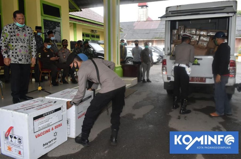Serah Terima vaksin yang di laksanakan di halaman pendopo kantor walikota Padangsidimpuan di sambut langsung oleh Walikota Padangsidimpuan selaku Ketua Satuan Tugas Penanganan Covid-19 di kota Padangsidimpuan Kamis, (04-02-2021) yang di dampingi wakil walikota,Forkopimda kota padangsidimpuan,sekdakota Padangsidimpuan, staf ahli dan pimpinan OPD lainya. Sebayak 3.120 Vall Vaksin Covid-19 diterima langsung oleh Pemerintah Kota Padangsidimpuan Selaku Satuan Tugas Penanganan Covid-19 di kota Padangsidimpuan yang di jemput langsung dari Provinsi Sumatera Utara. Walikota Padangsidimpuan selaku Ketua Satuan Tugas Penanganan Covid-19 Irsan Efendi Nasution,SH mengucapkan terimakasih dan apresiasi kepada seluruh tim penjemput vaksin covid-19. “Ini merupakan semangat baru bagi pemerintah dan seluruh masyarakat kota Padangsidimpuan karna adanya pandemi covid-19 akan segera berakhir. Ujar wako Beliau juga menyampaikan kepada seluruh jajaran pemerintah dan masyarakat kota Padangsidimpuan dapat menyukseskan pelaksanaan vaksinasi di kota Padangsidimpuan, yang rencana pelaksanaan vaksinasi di kota Padangsidimpuan akan dimulai Senin 8 Februari 2021. Beliau juga tidak lupa mengajak ataupun menghimbau kepada seluruh masyarakat kota Padangsidimpuan tetap mematuhi dan melaksanakan protokol kesehatan. “Pencanangan vaksinasi pertama akan di tunjuk sepuluh perwakilan pejabat daerah, unsur ulama, unsur pemuda, tokoh masyarakat dan di lanjutkan dengan vaksinasi oleh tenaga kesehatan di kota Padangsidimpuan.