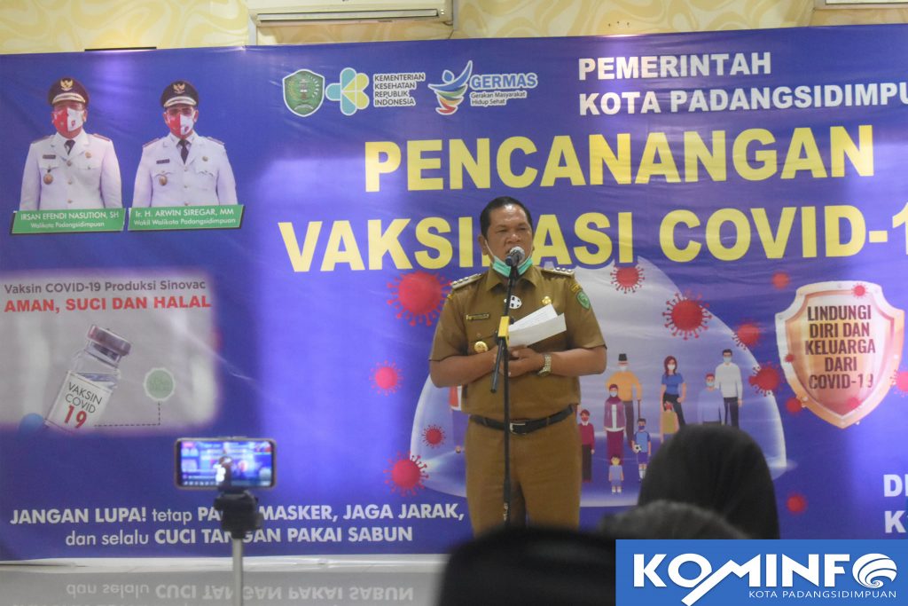Bertempat di Aula Utama Kantor Walikota Padangsidimpuan, Selasa 09 Februari 2021 Walikota Padangsidimpuan Irsan Efendi Nasution, SH penerima Vaksinasi pertama untuk menyakinkan masyarakat bahwa Vaksinasi itu aman dan halal. Setelah Walikota Padangsidimpuan di vaksinasi di sambung oleh Forkopimda Kota Padangsidimpuan antara lain, Kapolres Padangsidimpuan AKBP Juliani Prihartini.S.IK.MH, Ketua DPRD Kota Padangsidimpuan Siwan siswanto dan dilanjutkan oleh pengurus ikatan dokter Indonesia, dan tenanga kesehatan. Pencanangan vaksinasi covid-19 sebagai bentuk komitmen bersama untuk memutus mata rantai penularan covid-19 di Kota Padangsidimpuan. Walikota Padangsidimpuan, Irsan Efendi Nasution, SH menyampaikan bahwa vaksinasi itu aman dan halal dan saya juga berharap dengan adanya program vaksinasi ini mudah-mudahan dapat mengurangi penyebaran covid – 19 di kota Padangsidimpuan. Pemberian vaksinasi ini akan dilakukan dengan dua tahap. Tahap pertama dilaksanakan pada tanggal 09 Februari 2021 dan pemberian vaksin kedua akan dilaksanakan pada tanggal 23 Februari 2021 nanti.