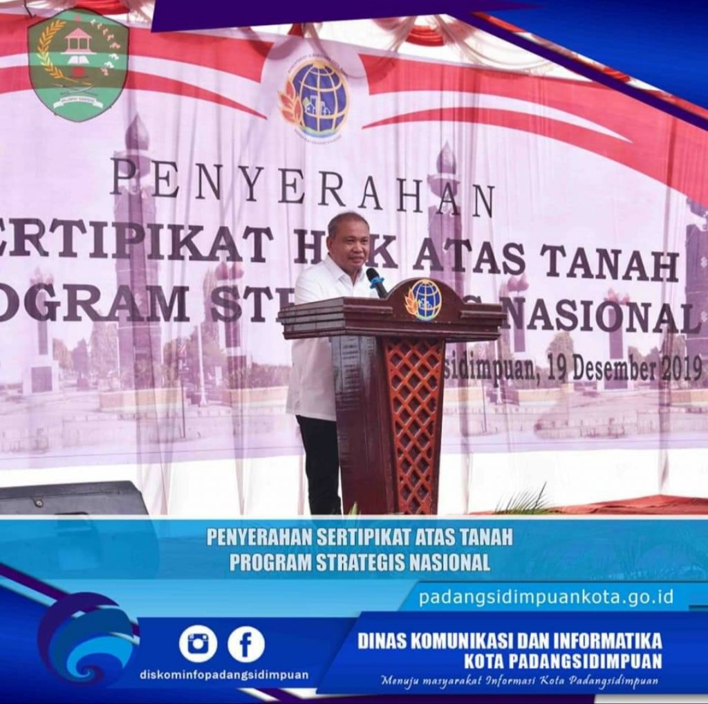Kepala Kantor Wilayah Badan Pertanahan Nasional (Kakanwil BPN) Sumatera Utara Bambang Priono SH, MH menyerahkan total 462 sertifikat tanah di Kantor Badan Pertanahan Nasional kota Padangsidimpuan, Palopat Pijorkoling, Kamis (19/12). Untuk warga Kota Padangsidimpuan yang mendapat sertifikat sebanyak 350 orang termasuk didalamnya aset pemko Padangsidimpuan sebanyak 3503 bidang. Untuk Kabupaten Tapanuli Selatan yang menerima sertifikat sebanyak 52 orang dan Kabupaten Mandailing Natal 60 orang. Bambang Priono menyampaikan, penyerahan sertifikat tanah ini adalah program strategis nasional yang diluncurkan Pemerintah Pusat melalui perintah Bapak Presiden RI Ir. Joko Widodo. Dan yang lebih membahagiakan lagi, kata Bambang dengan sertifikat tanah ini akan memacu pertumbuhan baru terutama perekonomian masyarakat, karena akan mendapatkan berbagai kemudahan ketika berhubungan dengan dunia perbankan. Juga akan memicu pertumbuhan-pertumbuhan baru pada segala sektor di Kota Padangsidimpuan dan sekitarnya. “Dan yang tidak kalah pentingnya lagi adalah menurunnya ribuan potensi sengketa pertanahan,” kata Bambang. Dalam sambutannya Bambang Priono juga menyampaikan terima kasih atas dukungan yang diberikan Walikota Padangsidimpuan bersama Bupati Tapanuli Selatan dan pihak-pihak yang mempunyai kapasitas, sehingga program PTSL dapat terlaksana secara maksimal sebagaimana yang diharapkan bersama. Walikota Padangsidimpuan Irsan Efendi Nasution, SH dalam sambutannya menyampaikan apresiasi dan terima kasih kepada seluruh jajaran Kanwil BPN Sumut dalam program sertipikat tanah menjadi hak milik yang diakui oleh negara. “Tentu ada banyak manfaat dengan penerbitan sertipikat yang merupakan program strategis nasional yang diluncurkan Presiden RI Bapak Joko Widodo. Dan diharapkan dapat dimanfaatkan semaksimal mungkin demi kerukunan, persatuan, peningkatan pertumbuhan ekonomi serta kesejahteraan masyarakat secara adil dan merata di Kota Padangsidimpuan,” katanya. Turut Hadir Kakanwin BPN Sumatera Utara Bambang Priono, Walikota Padangsidimpuan Irsan Efendi Nasution, SH, Bupati Tapanuli Selatan Syahrul M Pasaribu, Wakil Bupati Ir Aswin Efendi Siregar, Ketua BPN Padangsidimpuan.