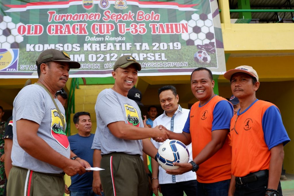 KODIM 0212/ tapsel gelar turnamen sepak bola OLD CRACK CUP U-35 TAHUN dalam rangka KOMSOS KREATIF TA 2019 bertempat di HM. Nurdin Kota Padangsidimpuan hari Sabtu 7 September 2019 Dandim 0212/ TS Letkol Inf Akbar Nofrizal Yusananto membuka Turnamen tersebut mengatakan kegiatan itu di laksanakan dalam rangka meningkatkan Komunikasi Sosial (Komsos) kreatif jajaran Kodim dengan warga masyarakat di seluruh wilayah. “kodim selaku satuan teritorial kewilayahan mempunyai beberapa kegiatan salah satunya adalah Komunikasi Sosial (KOMSOS) yaitu bertujuan memberikan informasi kepada masyarakat tentang hal hal yang berlaku saat ini termasuk isu-isu yang sedang berkembang dimasyarakat sehingga masyarakat tidak salah bertindak dalam kehidupan sehari hari. disamping itu Komsos juga ditujukan untuk menyambung lidah program-program pemerintah untuk disampaikan kepada kita semua, Nah kenapa disebut kreatif karena selama ini komsos hanya berwujud kegiatan tatap muka dan diskusi oleh karena itu ada perintah dan petunjuk dari komando atas, komsos perlu dikreatifkan artinya pemberian komunikasi kepada generasi muda ataupun pada masyarakat bias dilaksanakan melalui olahraga ataupun kegiatan-kegiatan seni budaya sesuai dengan kearifan lokal daerah masing masing. Tujuannya tetap sama untuk mewujudkan kemanunggalan TNI dengan rakyat.” Jelas dandim 0212/TS. Sebelum pluit wasit di bunyikan untuk dimulainya pertandingan , terlebih dahulu dilakukan Upacara seremoni, Dandim 0212/ TS Letkol Inf Akbar Nofrizal melakukan tendangan pertama di tengah lapangan. Turut hadir dalam acara Walikota padangsidimpuan Kapolres Kota Padangsidimpuan, Kadis Kominfo Kota Padangsidimpuan.