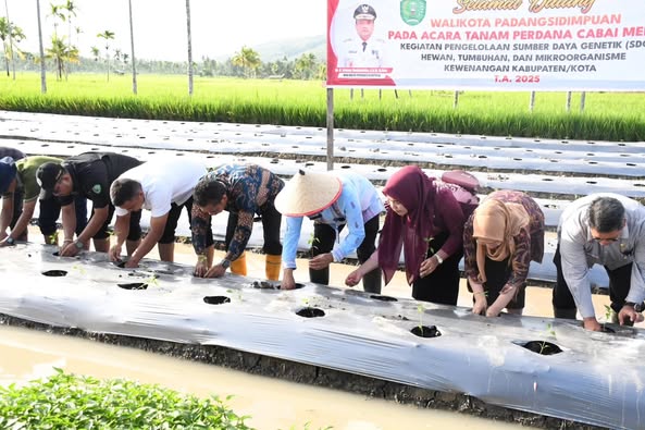 Wali Kota Padangsidimpuan, Dr. H. Letnan Dalimunthe, SKM, M.Kes hadiri penanaman perdana cabai merah yang dilaksanakan di Desa Manunggang Jae, Kecamatan Padangsidimpuan Tenggara pada Jum’at (18/07/2025). Dr. H. Letnan Dalimunthe, SKM, M.Kes mengutip pikiran Presiden Republik Indonesia, Prabowo Subianto, bahwa salah satu pondasi negara agar bertahan disituasi yang tidak menentu adalah dengan program ketahanan pangan. Beliau juga menyebutkan bahwa ketahanan pangan juga merupakan salah satu dari 8 delapan Asta Cita Presiden dan Wakil Presiden. “Stok pangan yang cukup, kehidupan yang makmur dan sehat menjadi harapan kita, dengan ketahanan pangan yang kuat kita berharap visi Indonesia Emas dan Indonesia Maju di tahun 2045 bakal terwujud. ” Harapnya. Dalam kesempatan itu, Dr. H. Letnan Dalimunthe, SKM, M.Kes juga menyampaikan agar pembentukan kelompok tani memiliki legalitas agas bisa mengakses bantuan pemerintah. Selain itu Dr. H. Letnan Dalimunthe, SKM, M.Kes juga menekankan kelompok tani dan penyuluh agar aktif dalam peningkatan produksi pertanian agar tidak bergantung lagi dari daerah lain. “Bagi Dinas Pertanian dan penyuluh, silahkan berikan penyuluhan terkait tanaman cabai ini kepada petani kita.” “Diharapkan produksi cabai kita membaik dan juga produksi padi dan tanaman lain sehingga menjadi contoh bagi daerah lain.” Pesan Wali Kota.