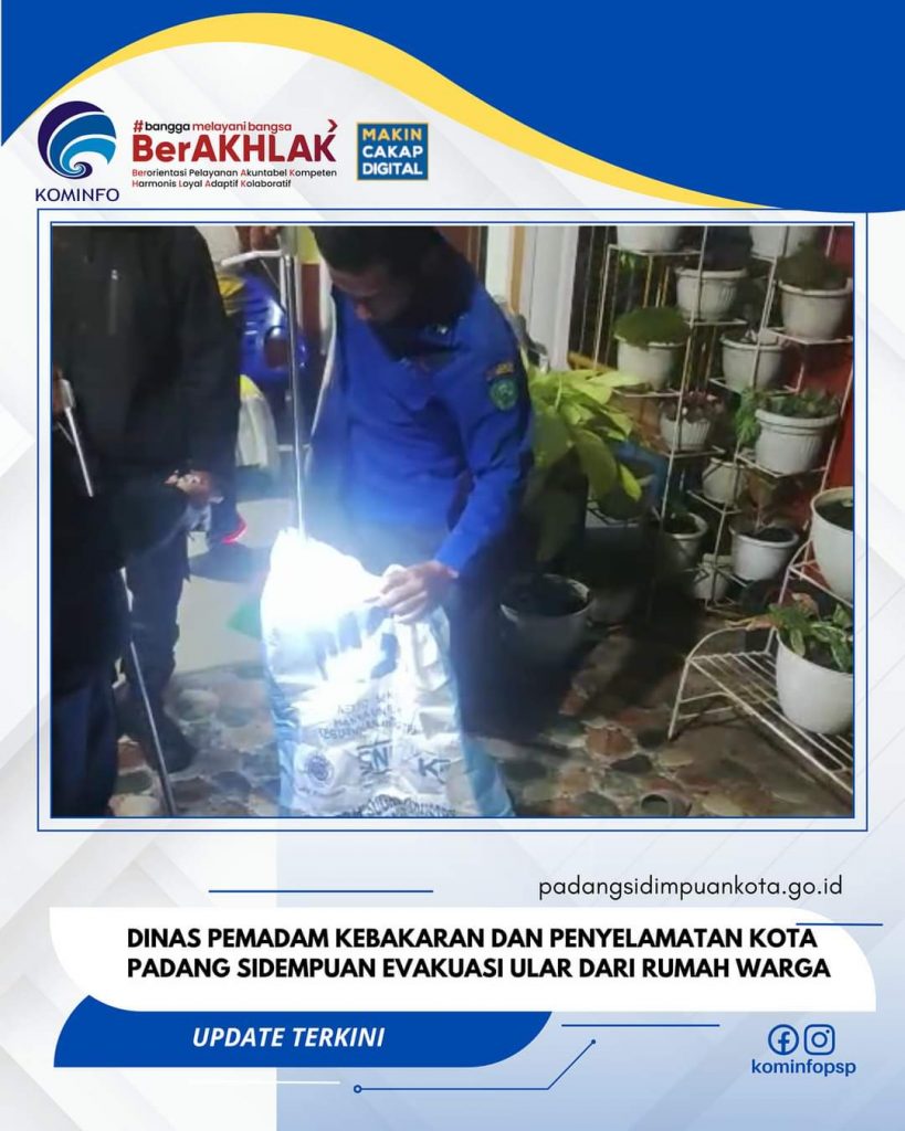 DINAS PEMADAM KEBAKARAN DAN PENYELAMATAN KOTA PADANG SIDEMPUAN EVAKUASI ULAR DARI RUMAH WARGA Dinas Pemadam Kebakaran dan Penyelamatan Kota Padang Sidempuan Evakuasi ular dari rumah seorang warga pada Senin (27/03/2023). Warga yang melaporkan adalah seorang ibu rumah tangga, Rohani Siregar (53) yang berdomisili di Jl. Pelita, Kelurahan Ujung Padang, Kec. Padang Sidempuan Selatan. Laporan untuk pertolongan non kebakaran yaitu evakuasi ular ini diterima oleh Dinas Pemadam Kebakaran dan Penyelamatan Kota Padang Sidempuan pada pukul 05.06 WIB. Saat proses evakuasi personil tidak menemui kendala dan keberadaan ular tidak menimbulkan korban pada warga.