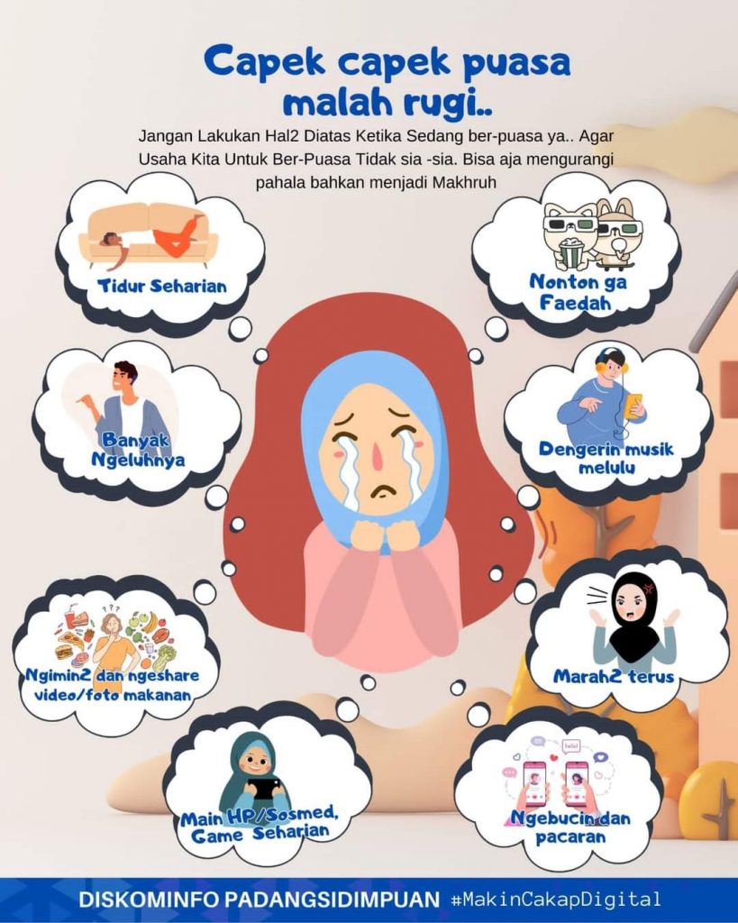 Halo, gimana puasa hari ini sahabat Kominfo? Jangan Lakukan hal- hal diatas Ketika Sedang ber-Puasa ya guys.. Agar Usaha Kita Untuk Ber-Puasa tidak sia- sia, bisa ngurangin pahala bahkan jadi makhruh?