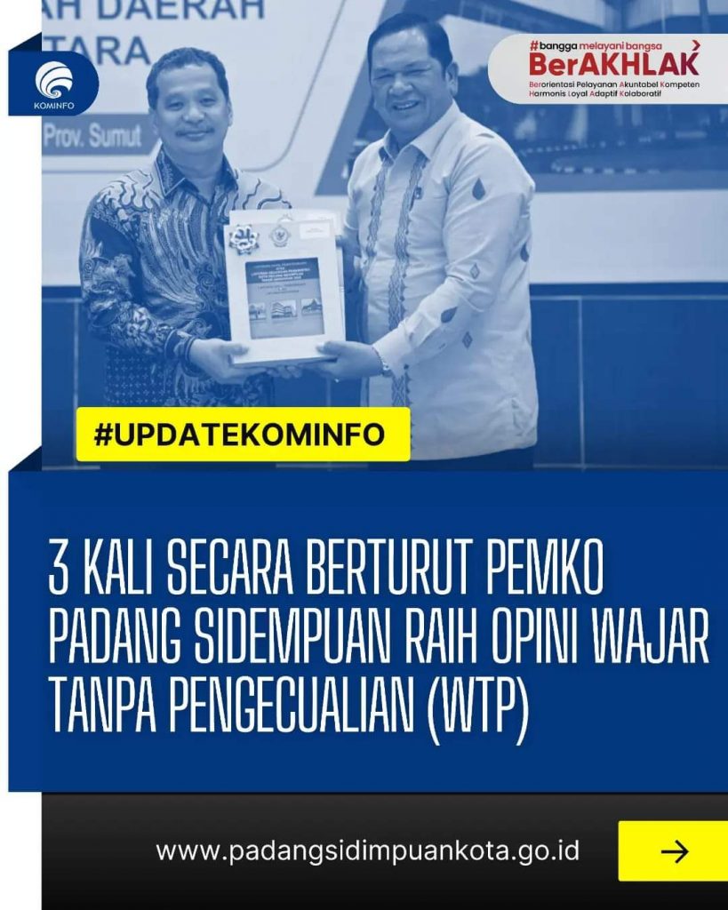 Untuk yang ketiga kalinya, Pemerintah Kota Padang Sidempuan kembali meraih Opini Wajar Tanpa Pengecualian (WTP) dari Badan Pemeriksa Keuangan (BPK) RI Perwakilan Provinsi Sumatera Utara (Provsu). Opini WTP diberikan berdasarkan Laporan Hasil Pemeriksaan (LHP) BPK RI Perwakilan Provsu atas Laporan Keuangan Pemerintah Daerah (LKPD) Kota Padang Sidempuan Tahun Anggaran 2022. Perolehan tersebut menjadi yang ketiga kalinya secara berturut-turut sejak LHP LKPD TA 2020. Usai menerima LHP, Walikota Padang Sidempuan Irsan Efendi Nasution, SH, MM di Kantor BPK RI Perwakilan Provsu, Medan, Selasa (18/4/2023), menyampaikan bahwa ini merupakan bukti komitmen Pemko Padang Sidempuan dalam memperbaiki sistem keuangan yang akuntabel. Dan ini sudah yang ketiga kalinya secara berturut-turut Pemko Padang Sidempuan meraih WTP dari BPK RI. “Ini merupakan komitmen kita (Pemko Padang Sidempuan) dalam memperbaiki sistem keuangan yang akuntabel, dan ini sudah ketiga kalinya secara berturut-turut Pemko Padang Sidempuan meraih WTP dari BPK RI.” “Kami menyampaikan apresiasi dan terimakasih kepada seluruh tim dari BPK RI perwakilan Sumatera Utara atas pemeriksaan terperincinya pada waktu yang lalu, dan ini merupakan salah satu hadiah yang spesial untuk Pemko Padang Sidempuan di akhir Ramadhan 1444 H, ungkap Walikota. Capaian ini pun diapresiasi oleh Kepala BPK RI Perwakilan Provsu, Eydu Oktain Panjaitan. Ia pun mengharapkan agar Pemko Padang Sidempuan bisa mempertahankan sekaligus meningkatkan kualitas laporan keuangannya sehingga semkain lebih baik lagi. “Kami sangat mengapresiasi Pemko Padang Sidempuan yang telah berhasil meraih WTP secara berturut-turut hingga sampai ketiga kalinya. Semoga ini bisa dipertahankan dan ditingkatkan lagi,” pungkasnya. Sebelumnya Mewakili Ketua DPRD Padang Sidempuan, Ketua Komisi I Erpi J Samudra mengucapkan terimakasih kepada seluruh tim yang telah turun ke padang Sidempuan dan telah melaksanakan tugasnya dengan sebaik baiknya. “Atas hasil capaian WTP ini kami dari DPRD Kota Padang Sidempuan mengucapkan terimakasih”, tandasnya.