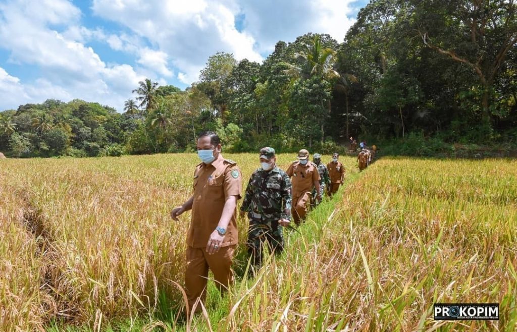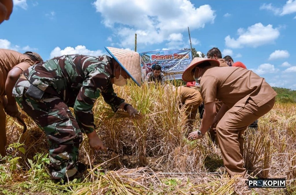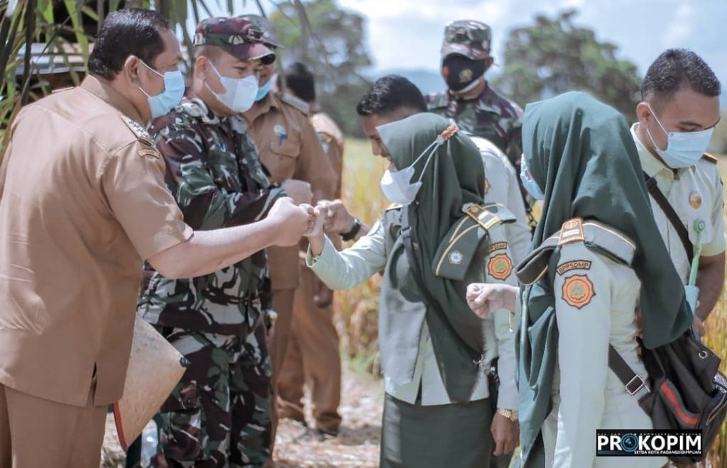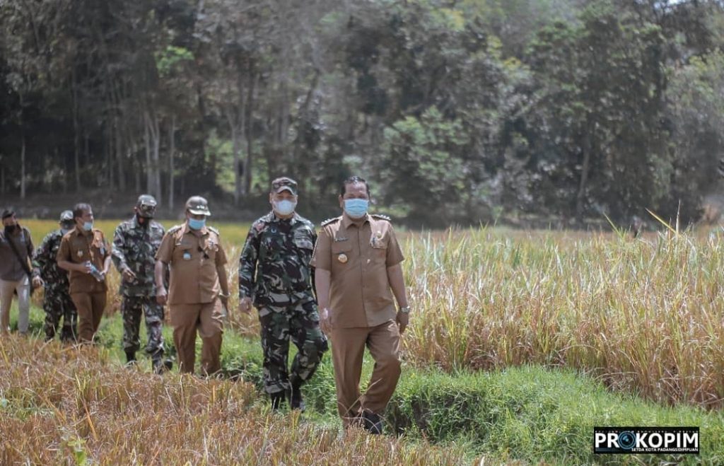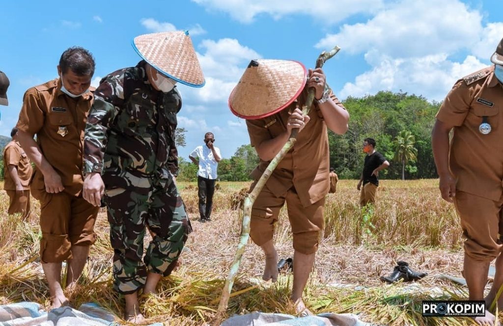 Walikota Padangsidimpuan Irsan Efendi Nasution SH bersama Dandim 0212/TS Letkol Inf Rooy Chandra Sihombing, S.I.P hadiri kegiatan panen perdana padi sawah dalam upaya peningkatan produksi pertanian dan ketahanan pangan pada kelompok Tani Suka Maju di Desa Aek Najaji Kec. Padangsidimpuan Batunadua, Senin, (09/08/2021).