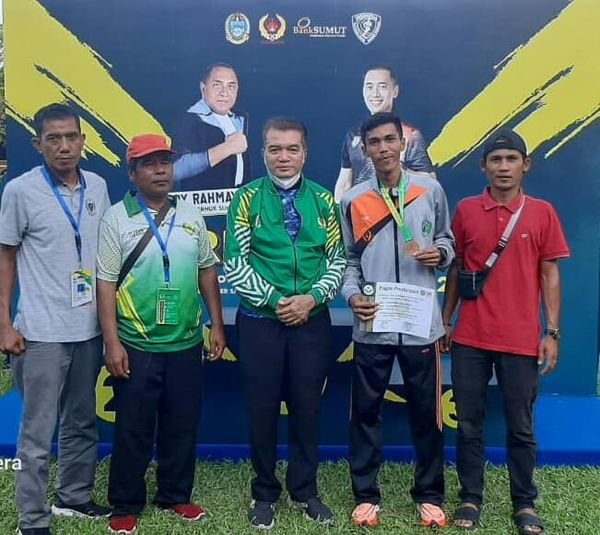 Ket Foto 2 : Gubsu Edy Rahmayadi mengalungkan medali perunggu kepada atlit lari gawang kota Padang Sidempuan Parmohonan.