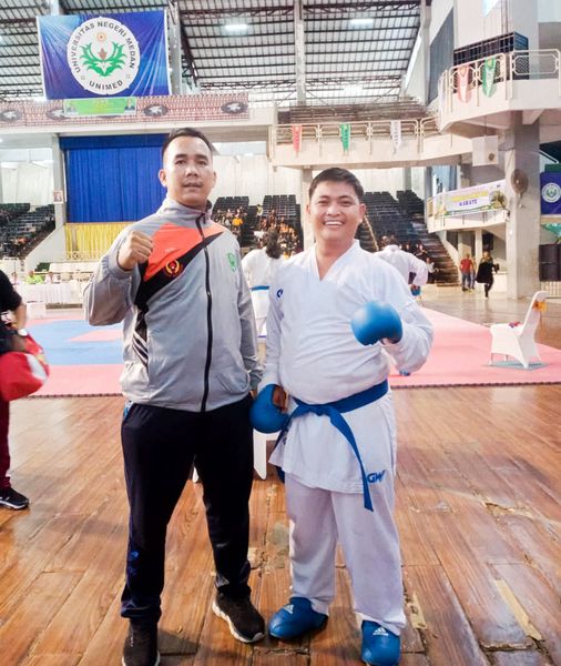 Ket Foto 1 : Ilham Tanjung Pelatih Karate Foto bersama Putra Geri Manalu peraih medali perunggu Yang turun dikelas 84 Kg +.