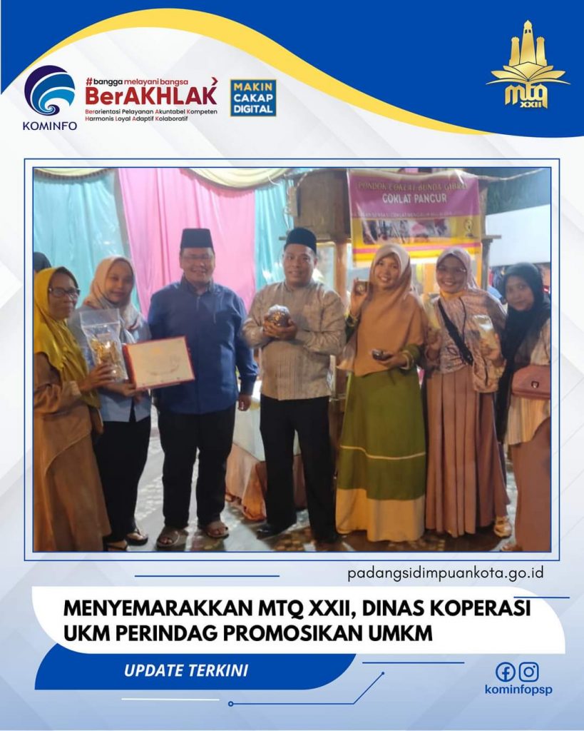 Dalam rangka mensukseskan pelaksanaan MTQ XXII Kota Padang Sidempuan, UMKM binaan dari Dinas Koperasi UKM Perindag turut menyemarakkan, menghidupkan suasa pelaksanaan MTQ dan sekaligus memperkenalkan dan mempromosikan produk produk olahan di UMKM kota Padang Sidempuan.