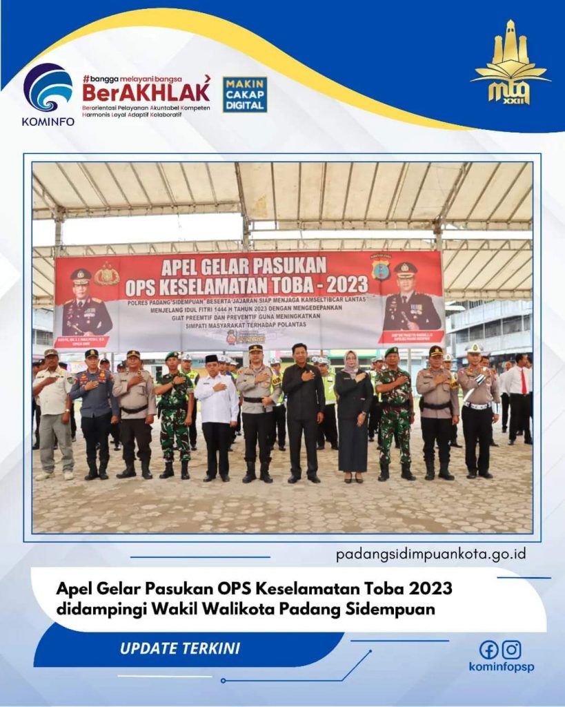 Wakil Walikota Padang Sidempuan Ir. Arwin Siregar, MM menghadiri apel gelar pasukan OPS keselamatan toba 2023. Apel dipimpin langsung Kapolres Padang Sidempuan AKBP Dwi Prasetyo Wibowo, SIK, di alaman bolak Kota Padang Sidempuan, Rabu (8/3).