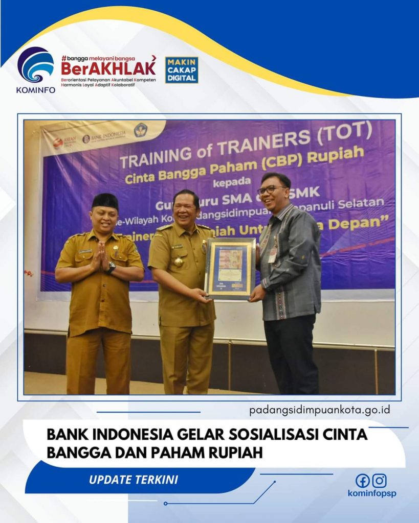 Sosialisasi berbentuk training of trainers (ToT) bertajuk “Trainer CBP Rupiah untuk Masa Depan” digelar di Emerald Hall Hotel Mega Permata Padang Sidempuan yang langsung di buka oleh Wali Kota Padang Sidempuan Irsan Efendi Nasution, SH. MM yang didampingi oleh Kaban Bapelitbang M. Yusar Nasution, mewakili Kadis Pendidikan Padang Sidempuan dan mewakili Kabag Perekonomian Setda Kota Padang Sidempuan.