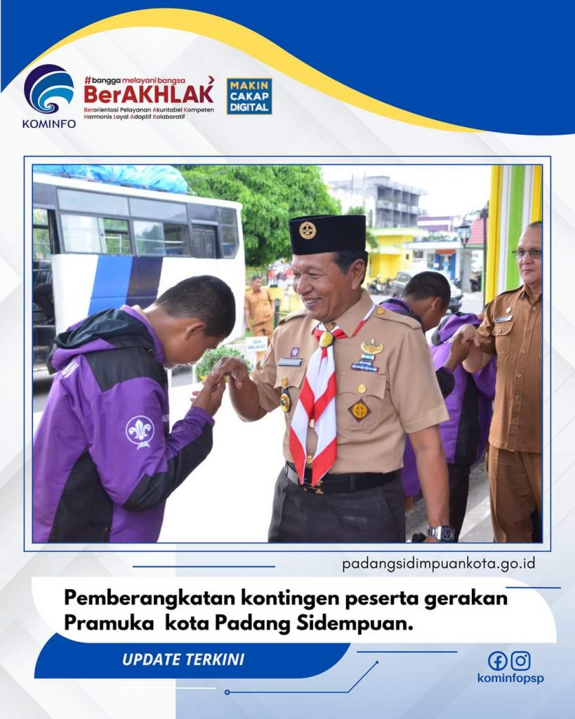 Wakil Wali Kota Padang Sidempuan Arwin Siregar melepas pemberangkatan Kontingen Peserta Gerakan Pramuka Kota Padang Sidempuan lomba tingkat IV (LT IV) tingkat kwartir daerah Sumatera Utara di taman Cadika lubuk pakam, Senin (13/03/23) di pendopo Kantor Wali Kota.