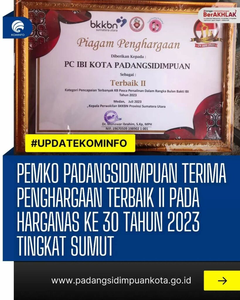 Di Hari Keluarga Nasional (HARGANAS) Tingkat Provinsi Sumatera Utara Tahun 2023 yang dilaksanakan di Kampung Ulos Desa Lumban Suhi-Suhi Kecamatan Pangururan Kabupaten Samosir, Sabtu 29 Juli 2023, Dinas KB PC IBI Kota Padangsidimpuan mendapat penghargaan Terbaik II Pelayanan KB Terbanyak Pasca Persalinan Tingkat Provinsi Sumatera Utara.